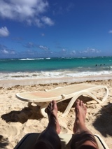 I made my way back to the resort and found Nana and Allen on the beach, sitting under the thatched umbrellas in large lounge chairs. The sky was a beautiful and clear blue, the water warm and inviting, the beach white, and the people busy raking up the sea weed. These beaches, like so many in the Caribbean are facing an unprecedented influx of seaweed. The afternoon was spent lolling on the beach talking, reading, splashing in the water and eating burgers grilled at the beach.